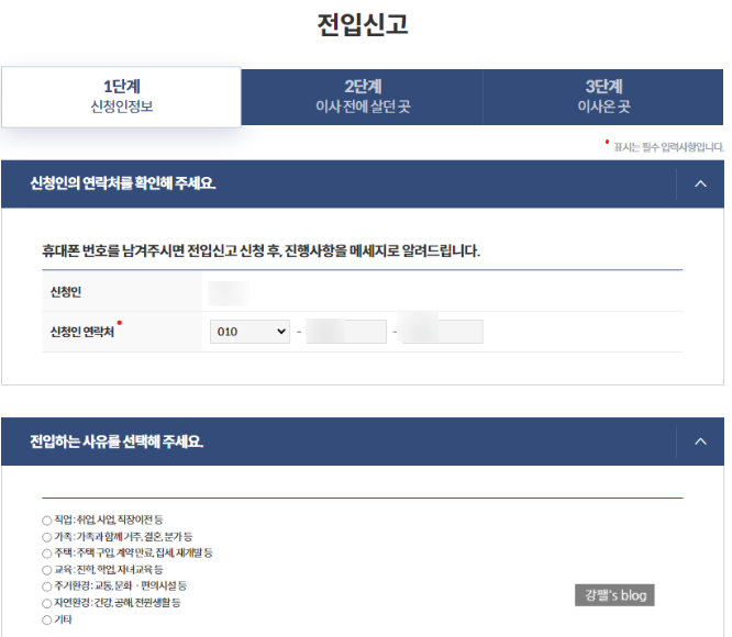 ③ 신청인의 연락처, 전입사유, 주소 입력등, 전입원 연락처 후 신청하기