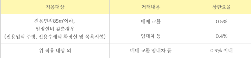 - 용면적 85㎡ 이하 일정설비를 갖춘 경우 매매는 0.5%,