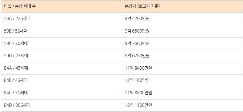 59는 9억 초중반대, 84는 11억 후반 ~ 12억 초반대이 분양가를