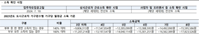 무주택세대구성원 (신혼부부는 혼인신고일로부터 입주자모집공고일현재까지 계속 무주택자여야 함)- 혼인기간이 7년 이내(혼인신고일 기준, 동일인과의 재혼인 경우에는이전 혼인기간을 포함)인 분- 「신혼부부 주택 특별공급 운용지침」에서 정하는 소득기준 또는자산기준을 충족하는 분- 소득기준 충족 (2023년도 기준) : 외벌이 140%, 맞벌이 160%- 자산기준 충족 : 부동산 3.31억 원 이하