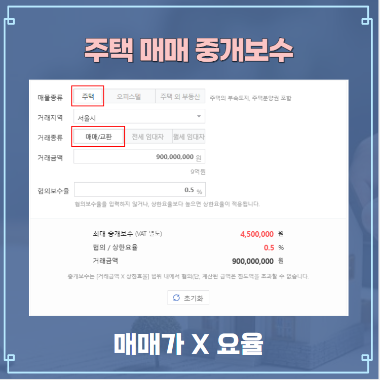 주택 매매의 경우 매매가 X 요율 = 중개보수가 결정됩니다.