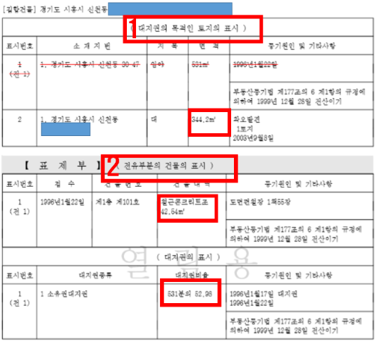등기사항전부증명서의 표제부를 확인해야 합니다.