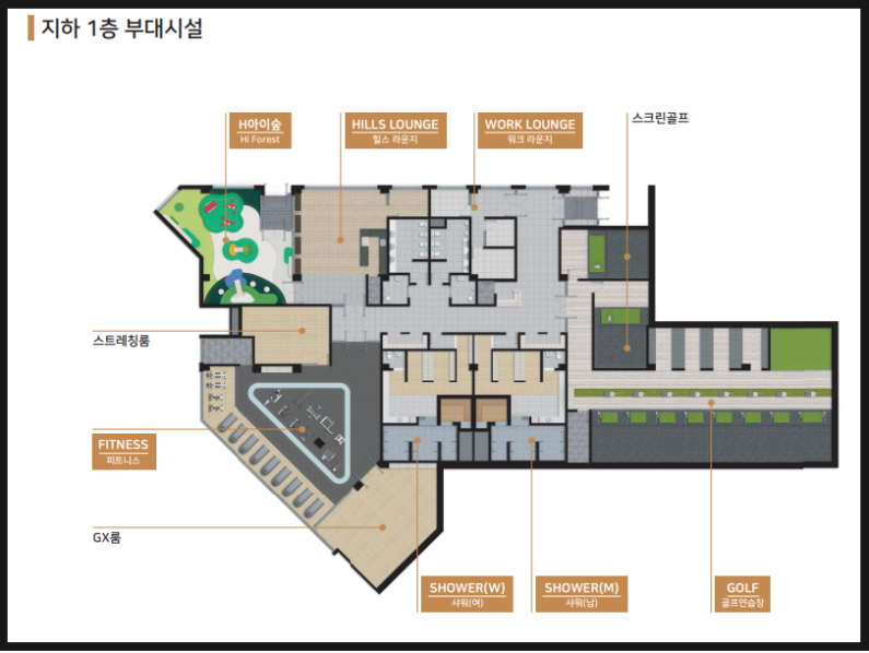 골프연습장, 피트니스/GX룸, 샤워, 경로당 등 기본적인 편의시설로